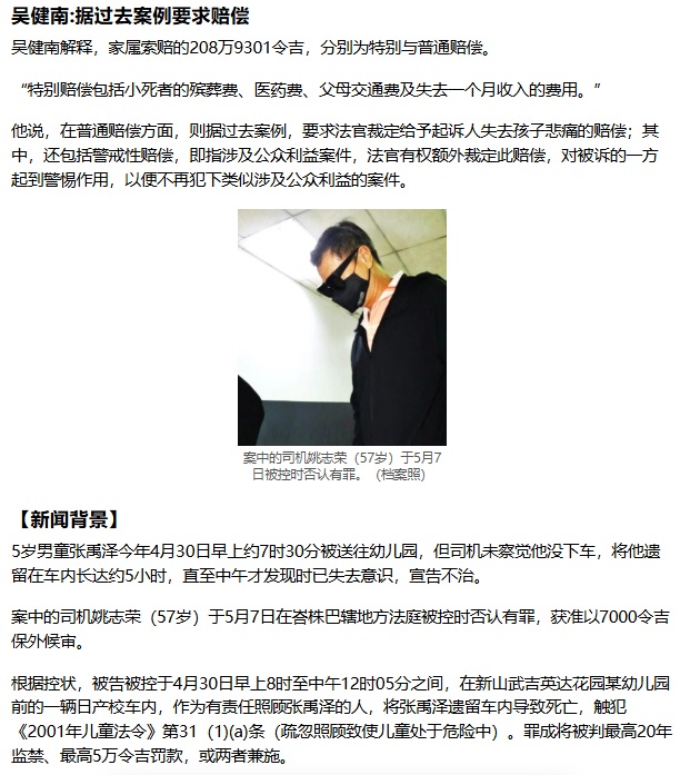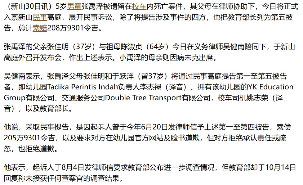链接来源:【视频】5岁童被遗留校车命案〡父母展开民事诉讼 诉教长等索赔逾208万 – 国内 – 即时国内