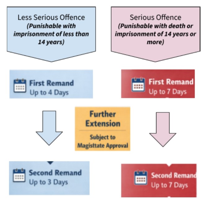 The law sets limits on how long a person can be held on remand. If the investigation is not completed within the first remand, the police must apply again to the court for an extension, and the Magistrate will decide whether further detention is justified. The periods for which remand can be granted are shown in the diagram below.